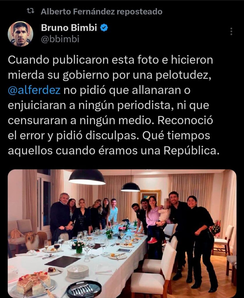 Fernández compartió un mensaje del periodista Bruno Bimbi que recordaba la controversia generada en 2021 por la foto del cumpleaños de Fabiola Yáñez en la Quinta de Olivos, en pleno contexto de restricciones por la pandemia. En ese momento, la imagen provocó un fuerte impacto negativo para su administración, aunque el exmandatario optó por no iniciar acciones judiciales contra la prensa ni perseguir a periodistas. En cambio, decidió reconocer públicamente el error y pedir disculpas.