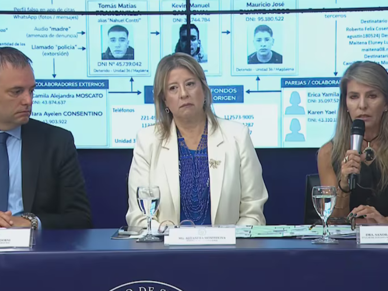 Acompañada por el jefe de Gabinete, Manuel Adorni, y la jueza federal Sandra Arroyo Salgado, brindó una conferencia de prensa en la que detalló que los implicados se contactaron con la víctima a través de una app de citas con un perfil falso denominado “Julieta Ayelén Cardozo”.