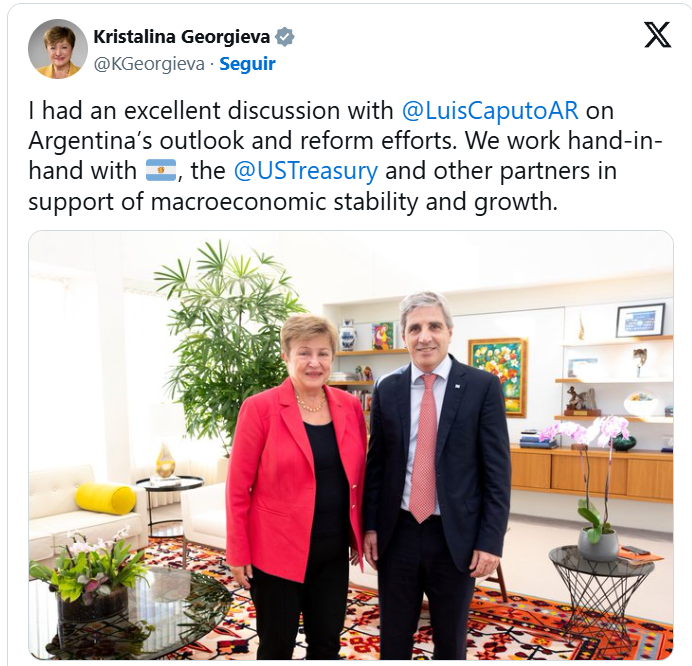 En un mensaje publicado en la red social X, Georgieva afirmó: “Tuve una excelente conversación con @LuisCaputoAR sobre las perspectivas de Argentina y las reformas que se están llevando a cabo”. Además, subrayó que el FMI trabaja en conjunto con el @USTreasury y otros socios internacionales para sostener la estabilidad macroeconómica y el crecimiento sostenible.