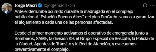 El jefe de Gobierno porteño, Jorge Macri, replicó el mensaje y afirmó: “Ante el derrumbe ocurrido durante la madrugada en el complejo habitacional ‘Estación Buenos Aires’ del plan ProCreAr, vamos a garantizar el alojamiento a cada una de las personas afectadas”.