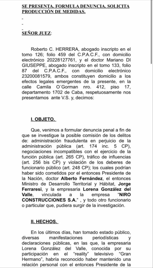 La presentación fue realizada ante el Juzgado en lo Criminal Federal por los abogados Roberto Herrero y Mariano Di Giuseppe, quienes solicitaron que sean investigadas presuntas irregularidades durante la gestión de Fernández en la adjudicación de obras públicas en el marco del programa PROCREAR y que también se analice el rol del actual intendente de Avellaneda,