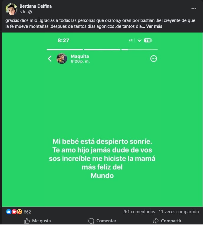 Junto a esas palabras, la mujer puso un mensaje de la mamá de Bastian donde confirmó horas antes la buena noticia sobre la evolución del niño: “Mi bebé está despierto, sonríe. Te amo hijo, jamás dudes de vos. Sos increíble, me hiciste la mamá más feliz del mundo”, había escrito.