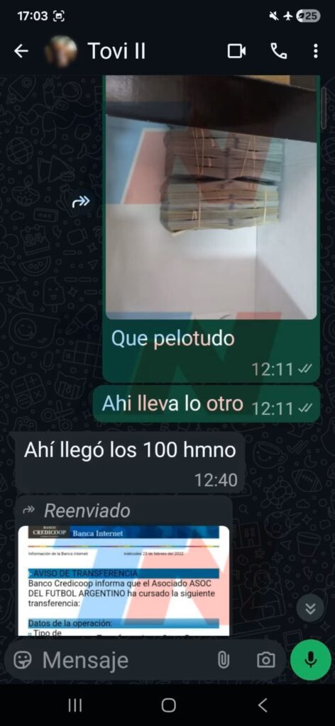 El chat finaliza con la confirmación de Toviggino de la entrega del dinero que faltaba: “Ahí llegó los 100 hmno”, a lo que le agrega una imagen con la confirmación de la transferencia realizada de forma virtual a través del Banco Credicoop.