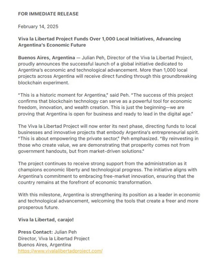 El texto señalaba a Julian Peh como director del proyecto e incluía declaraciones suyas. En uno de los pasajes, Peh afirmaba: “Este es un momento histórico para Argentina. El éxito de este proyecto confirma que la tecnología blockchain puede ser una herramienta poderosa para la libertad económica, la innovación y la generación de riqueza. Esto es solo el comienzo: estamos demostrando que Argentina está abierta para los negocios y lista para liderar en la era digital”. Además, el comunicado prometía financiar al menos 1000 iniciativas locales, lo que buscaba mostrar al proyecto como un motor de desarrollo económico y tecnológico.