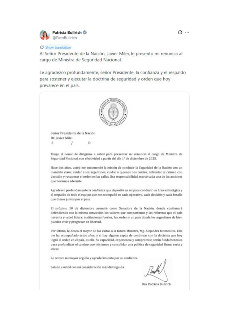 En su mensaje, Bullrich expresó: “Al Señor Presidente de la Nación, Javier Milei, le presento mi renuncia al cargo de Ministra de Seguridad Nacional. Le agradezco profundamente, señor Presidente, la confianza y el respaldo para sostener y ejecutar la doctrina de seguridad y orden que hoy prevalece en el país”.