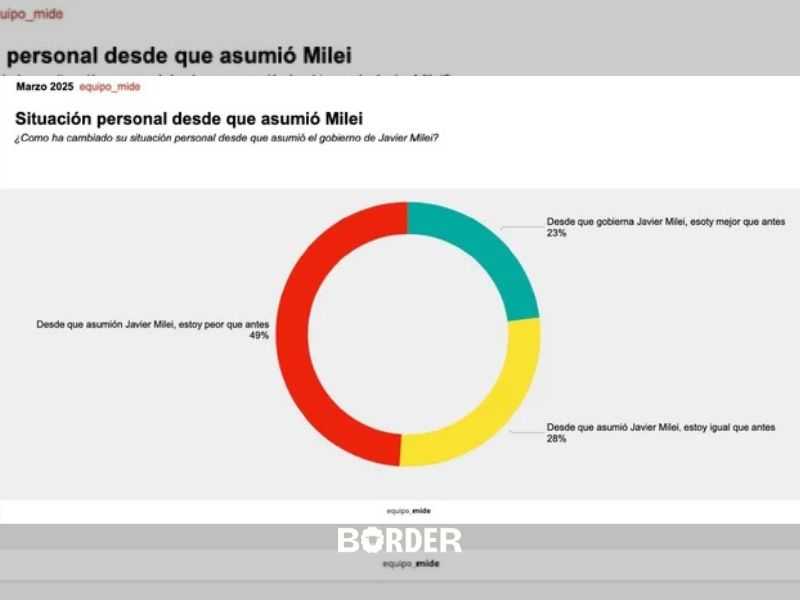 A la vez, se les preguntó por su situación personal, desde la asunción del nuevo Gobierno Nacional, y el 49% confesó estar “peor que antes” y el 28% consideró “estar igual”; con respecto a las medidas económicas tomadas por Milei el 40% está “muy en desacuerdo” y el 11% “parcialmente en desacuerdo”.