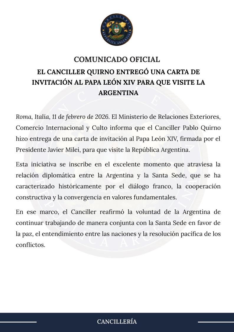 En su mensaje en redes sociales, Quirno escribió que "la relación entre la Argentina y la Santa Sede se ha caracterizado históricamente por el diálogo franco, la cooperación constructiva y la convergencia de valores fundamentales: hoy atraviesa un excelente momento. En ese espíritu, hice entrega de una carta de invitación del Presidente