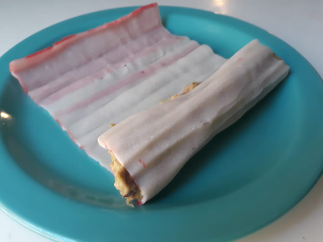 4.- Lo que sigue es desenrollar las barras de surimi que nos servirán de masa de contención de estos deliciosos canelones fríos.
