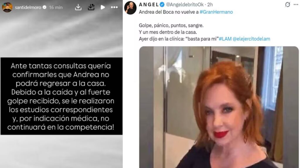 El hecho ocurrió en la cocina, cuando Andrea se resbaló y cayó de frente, golpeando su cabeza contra una de las puertas del mueble ubicado junto a la heladera. El impacto fue fuerte y la actriz quedó tendida en el suelo, manifestando que no podía levantarse por sus propios medios. La producción activó de inmediato el protocolo de emergencia y los médicos ingresaron para asistirla. Del Boca fue retirada en camilla y trasladada para realizar estudios clínicos exhaustivos. Los resultados confirmaron la gravedad del golpe y derivaron en la decisión médica de que no regrese a la competencia.