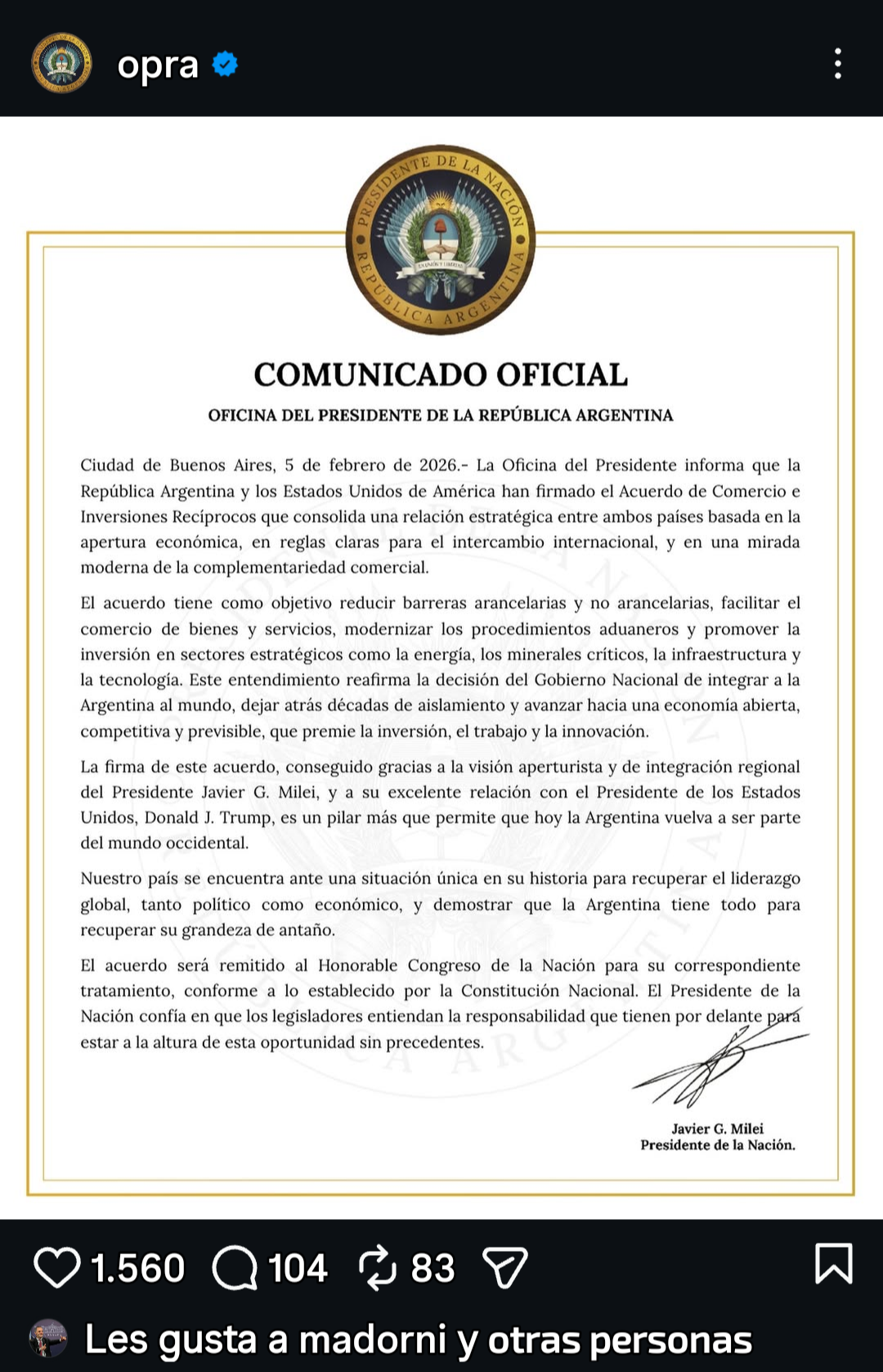 El Gobierno nacional confirmó que firmó un acuerdo comercial con Estados Unidos, marcando un paso importante para la economía del país. Esta iniciativa busca fortalecer los vínculos económicos bilaterales y abrir nuevas oportunidades para los sectores productivos argentinos.
