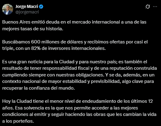 El jefe de Gobierno porteño señaló en su cuenta de X: "Buenos Aires emitió deuda en el mercado internacional a una de las mejores tasas de su historia. Buscábamos 600 millones de dólares y recibimos ofertas por casi el triple, con un 82% de inversores internacionales".
