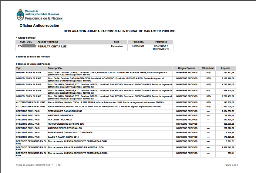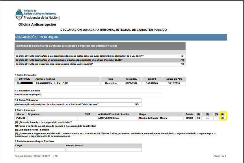 Como fuere, hay que darle crédito a Aranguren por haber decidido revelar su patrimonio ante la requisitoria de un medio, antes de siquiera hacerlo ante la OA. La presentación oficial de Aranguren estuvo disponible una semana después, para sumarse a un muy pequeño grupo de funcionarios debutantes en cargos que hicieron los deberes. (Otros funcionarios, incluido Macri, dejaron vigentes las DDJJ que hace poco debieron presentar por haber sido candidatos a cargos electivos o por haber sido legisladores, como acepta la OA).