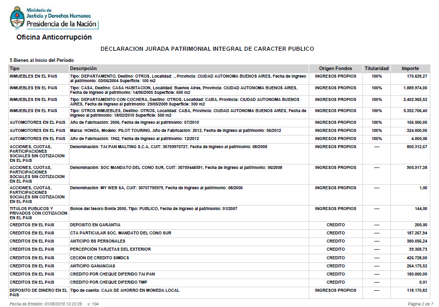 Además, tiene acciones en dos empresas en el país, la maltería Tai Pan Malting S.C.A y Soc Mandato del Cono Sur. De ambas tiene casi un millón de pesos en acciones.