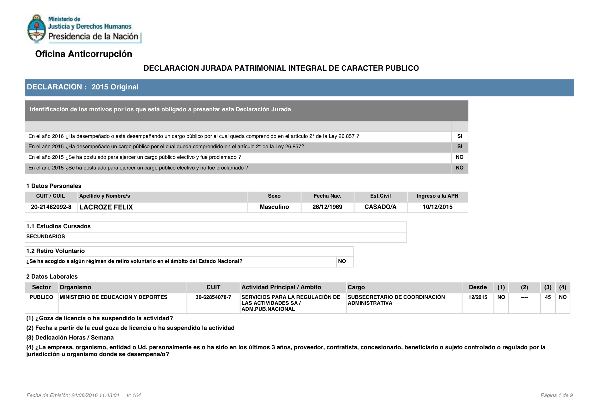 Se trata de Félix Lacroze, subsecretario de Coordinación Administrativa del Ministerio de Educación y Deportes. Hacia fines de 2015, según su declaración jurada, tenía bienes y depósitos por $ 81,6 millones y deudas por $ 12,3 millones. Ya a principio de año, por una serie de despidos, este amante del polo se tuvo que sentar a negociar con Roberto Baradel y otros gremialistas.