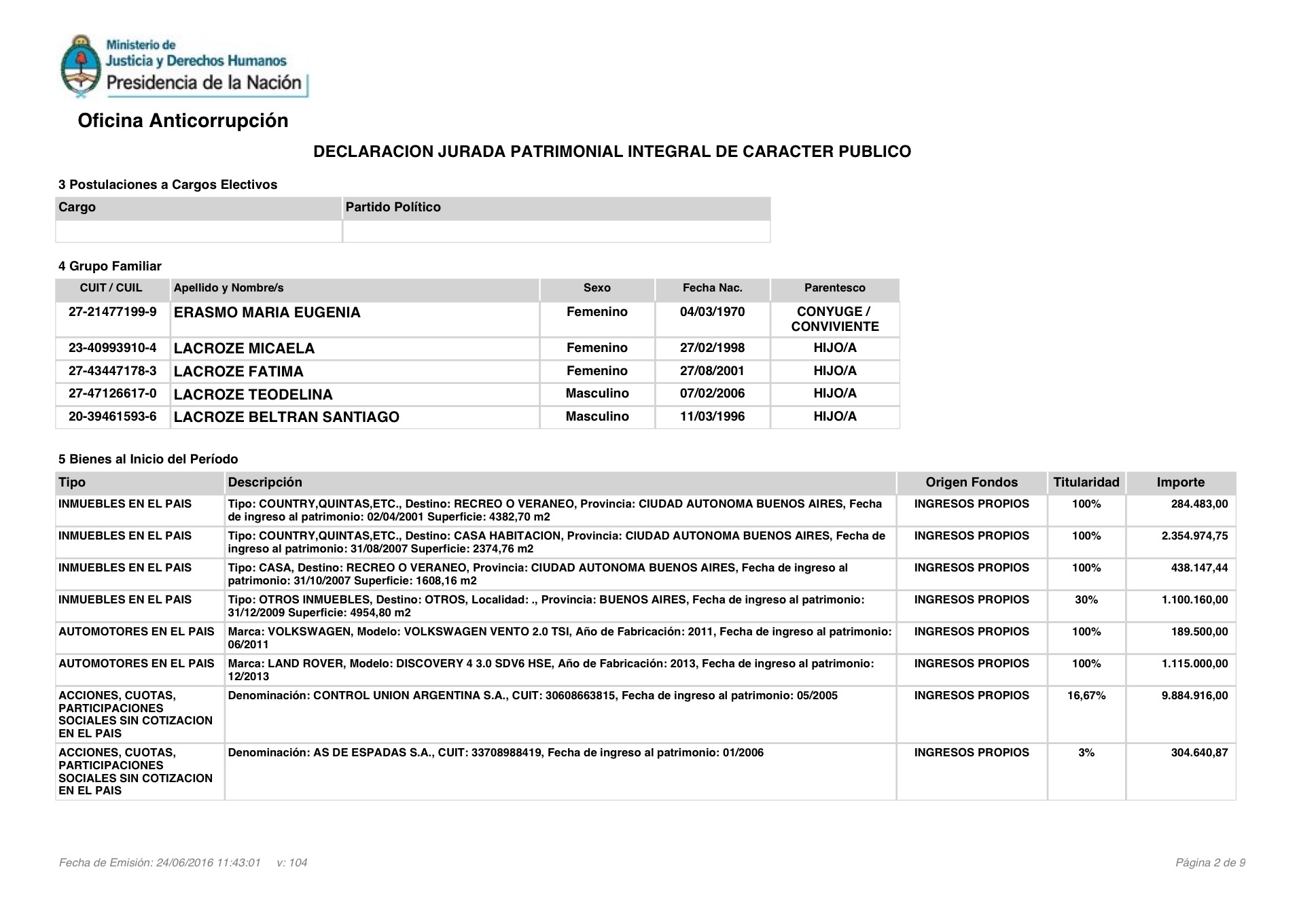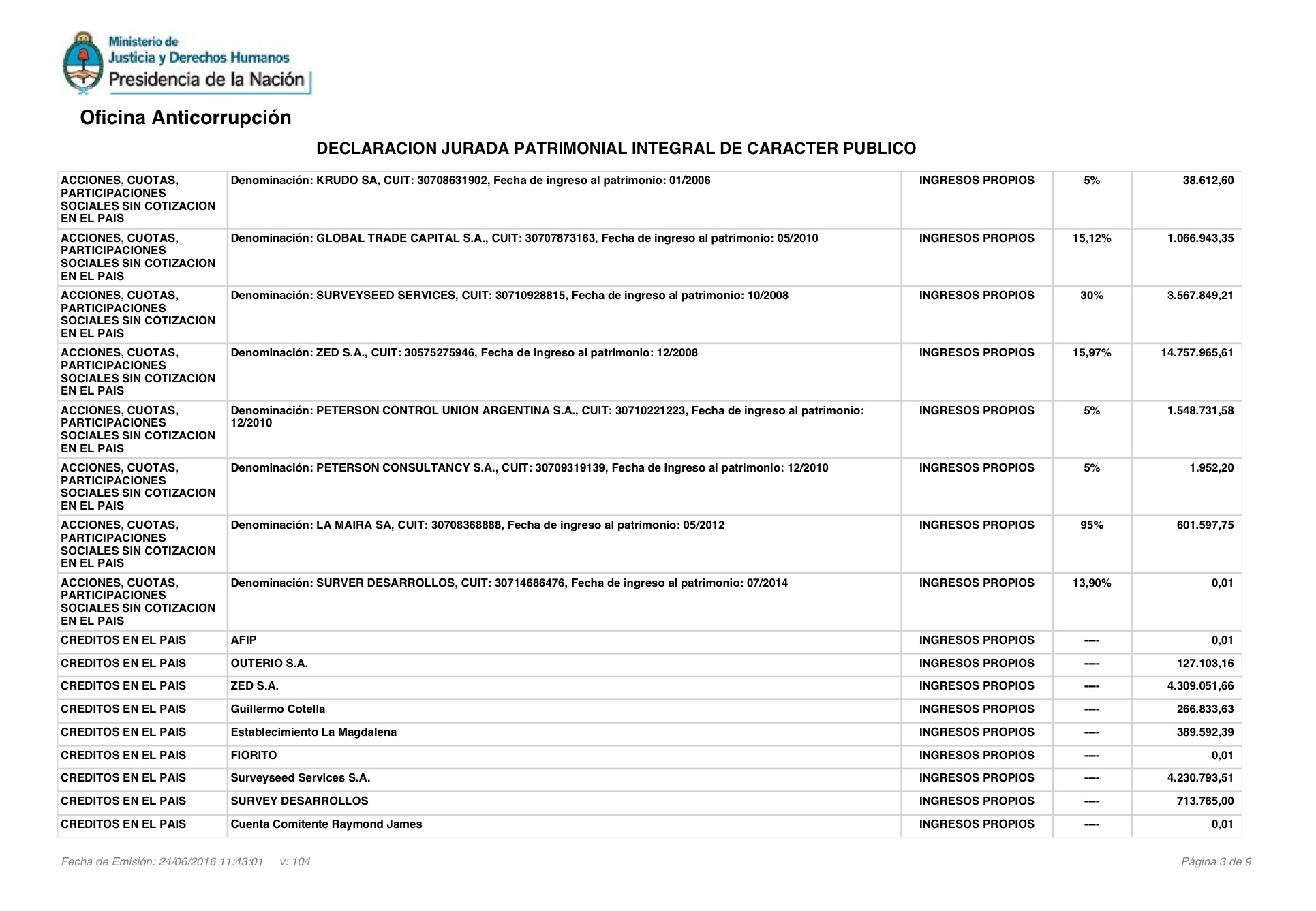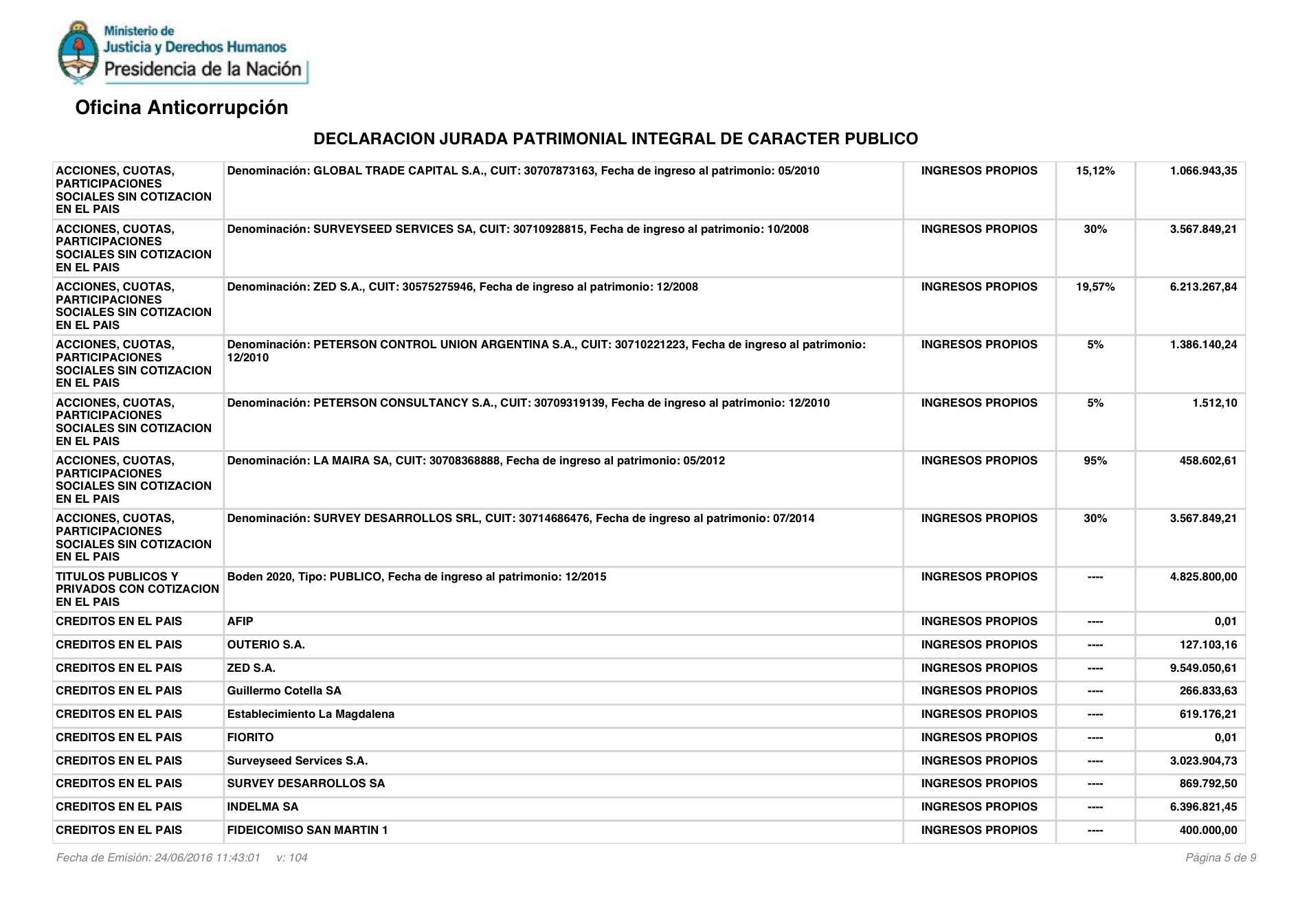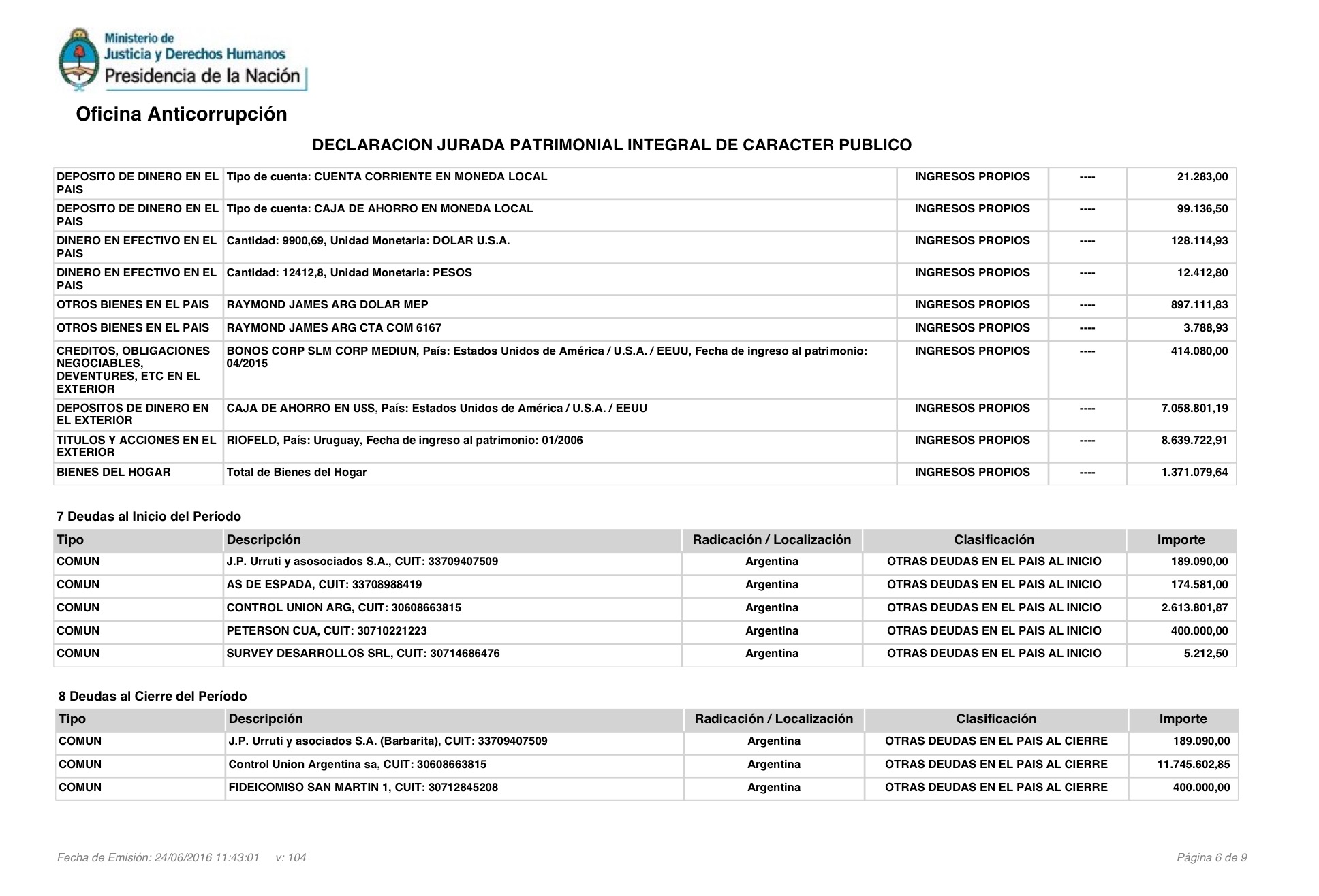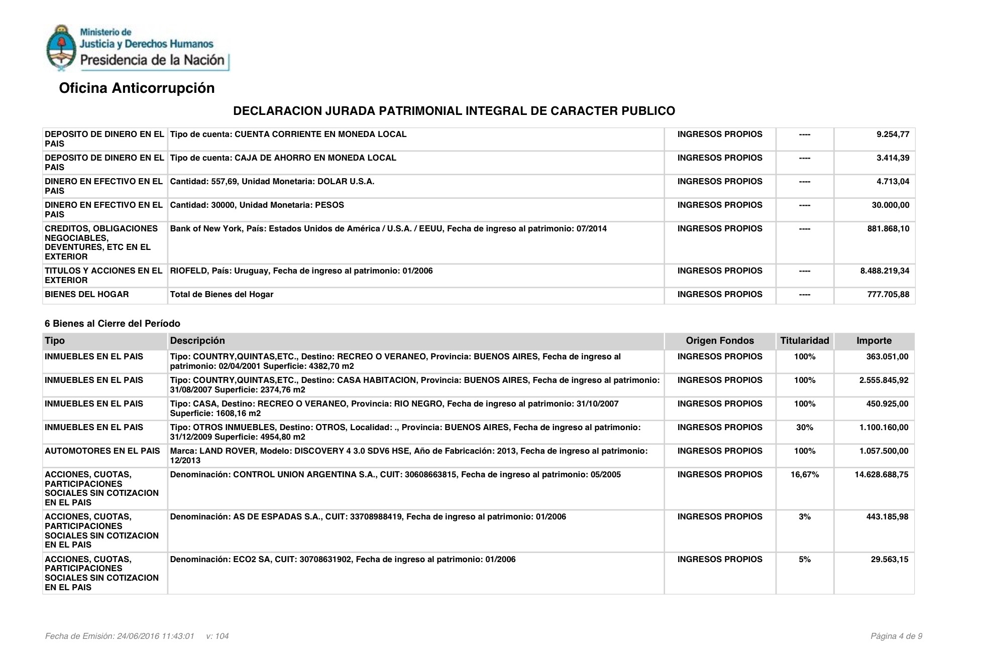 En su declaración jurada (completa abajo), también se destaca una caja de ahorros en Estados Unidos, por unos 7 millones de pesos, y una empresa en Uruguay (Riofeld), valuada en 8,6 millones de pesos.