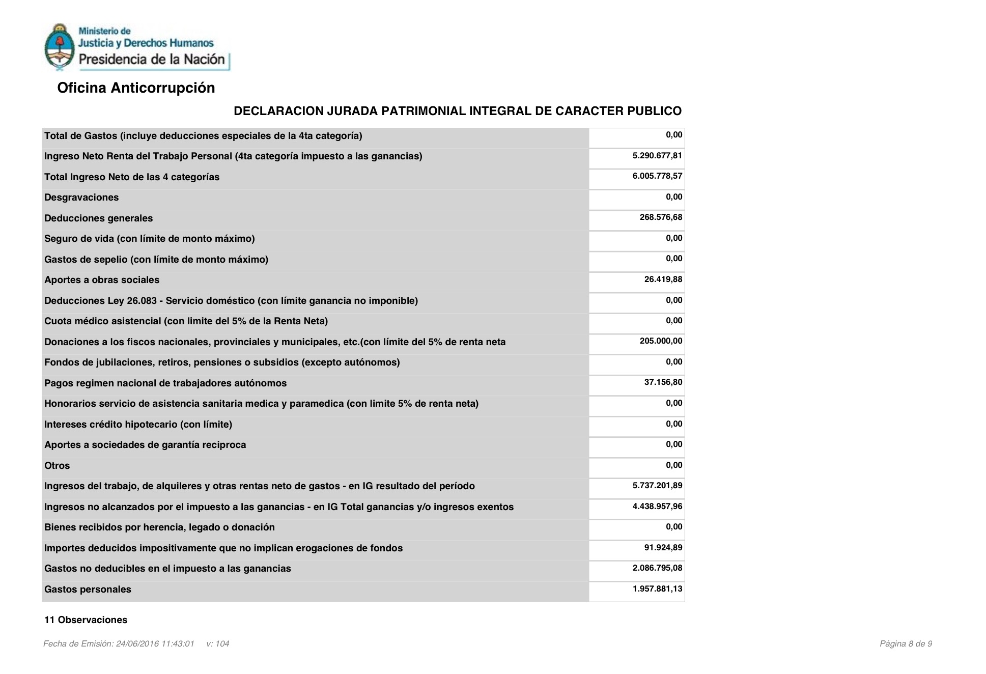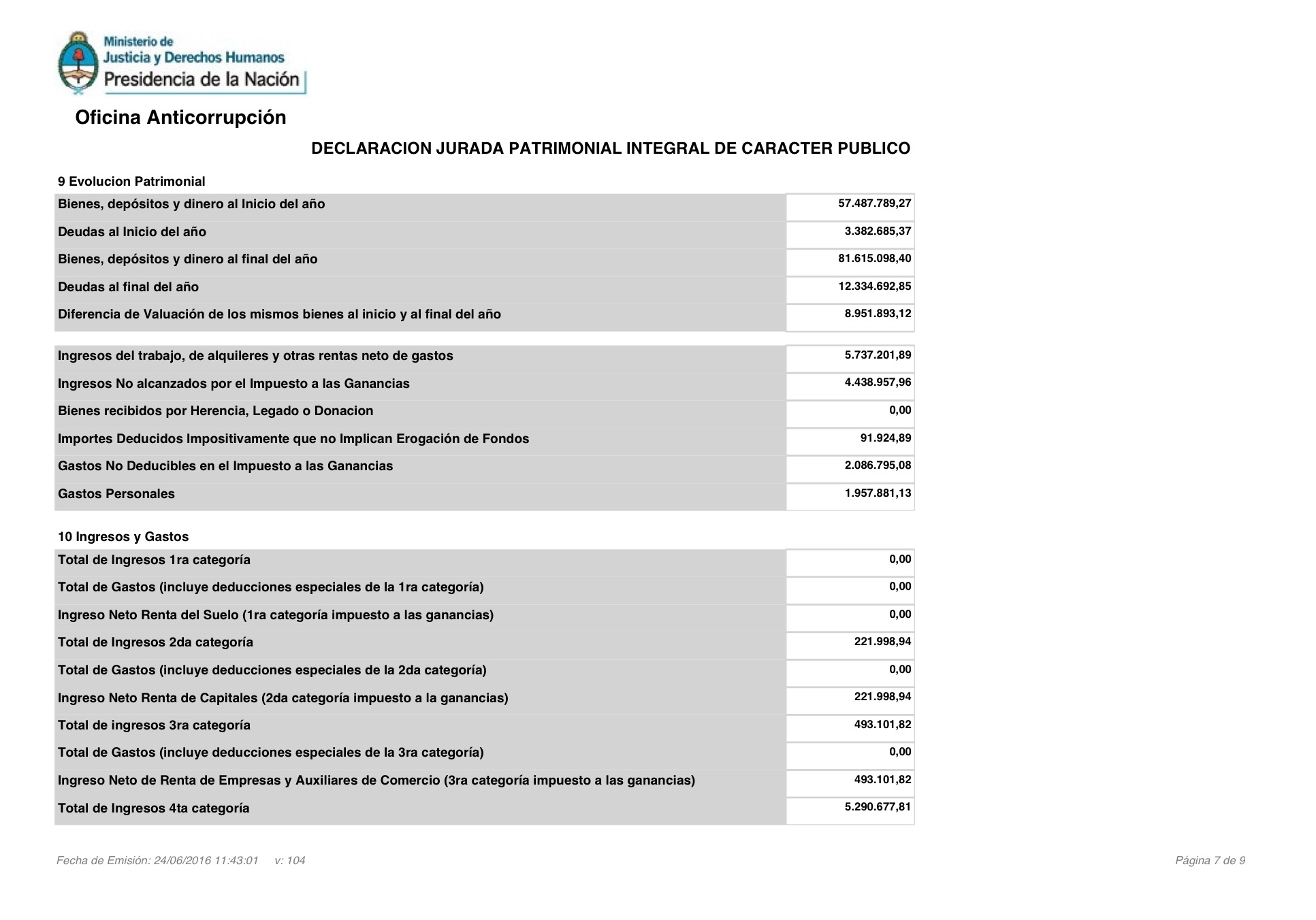 Según lo que informó ante la Oficina Anticorrupción en su última declaración jurada (las de este año todavía no se cumplió el plazo), su patrimonio hacia fines de 2015 ascendía a los $ 81,6 millones. Eso lo convierte en el décimo funcionario más rico, sólo detrás de Horacio Levin (RTA SE), Guillermo Laje (Embajada de EEUU), Luis María Ribaya (Banco Nación), Matías Tamburini (Anses), Mauricio Macri, Horacio Reyser (Cancillería), Juan José Aranguren (Energía) , Luis Caputo (Finanzas) y Atilio Benedetti (Banco Nación). Además, declaró deudas por $ 12,3 millones.