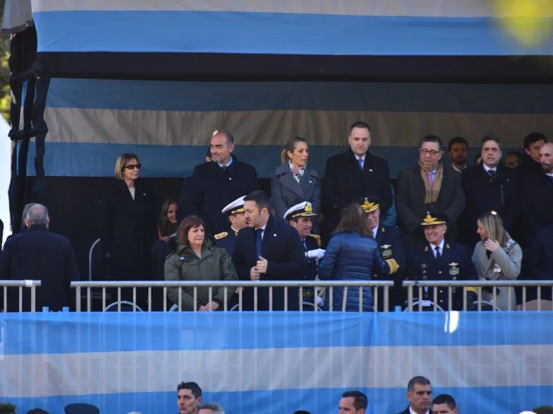 El presidente Javier Milei se ubicó en el palco principal, en Libertador y Austria- A su izquierda, la vicepresidenta Victoria Villarruel (cabe recordar que ayer no participó de la firma del Pacto de Mayo alegando que estaba engripada) ; la secretaria de Presidencia, Karina Milei; el presidente de la Cámara de Diputados, Martín Menem; el ministro de Justicia, Mariano Cuneo Libarona; la canciller, Diana Mondino y el flamante ministro de Desregulación y Transformación del Estado, Federico Sturzenegger.
