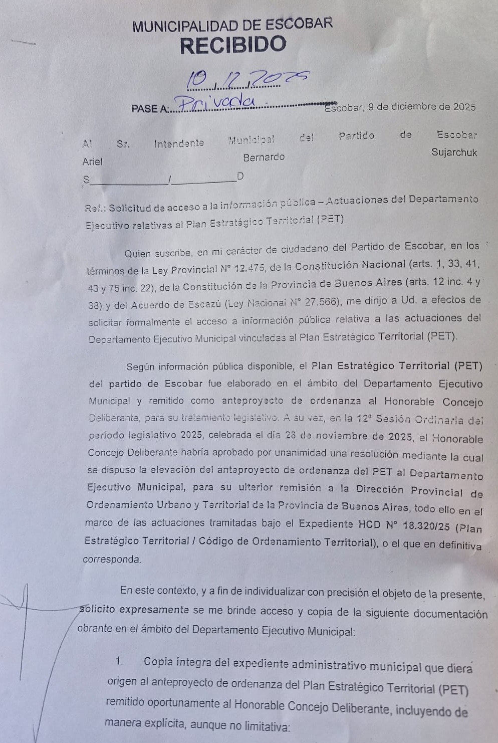 Los vecinos presentaron solicitudes formales de acceso a la información pública para obtener la documentación completa vinculada al PET. En las cartas invocan expresamente la Ley Provincial 12.475, la Constitución Nacional, la Constitución bonaerense y el Acuerdo de Escazú, remarcando que, por tratarse de un plan con impacto territorial y ambiental, el acceso debe ser pleno, oportuno y accesible para cualquier ciudadano.