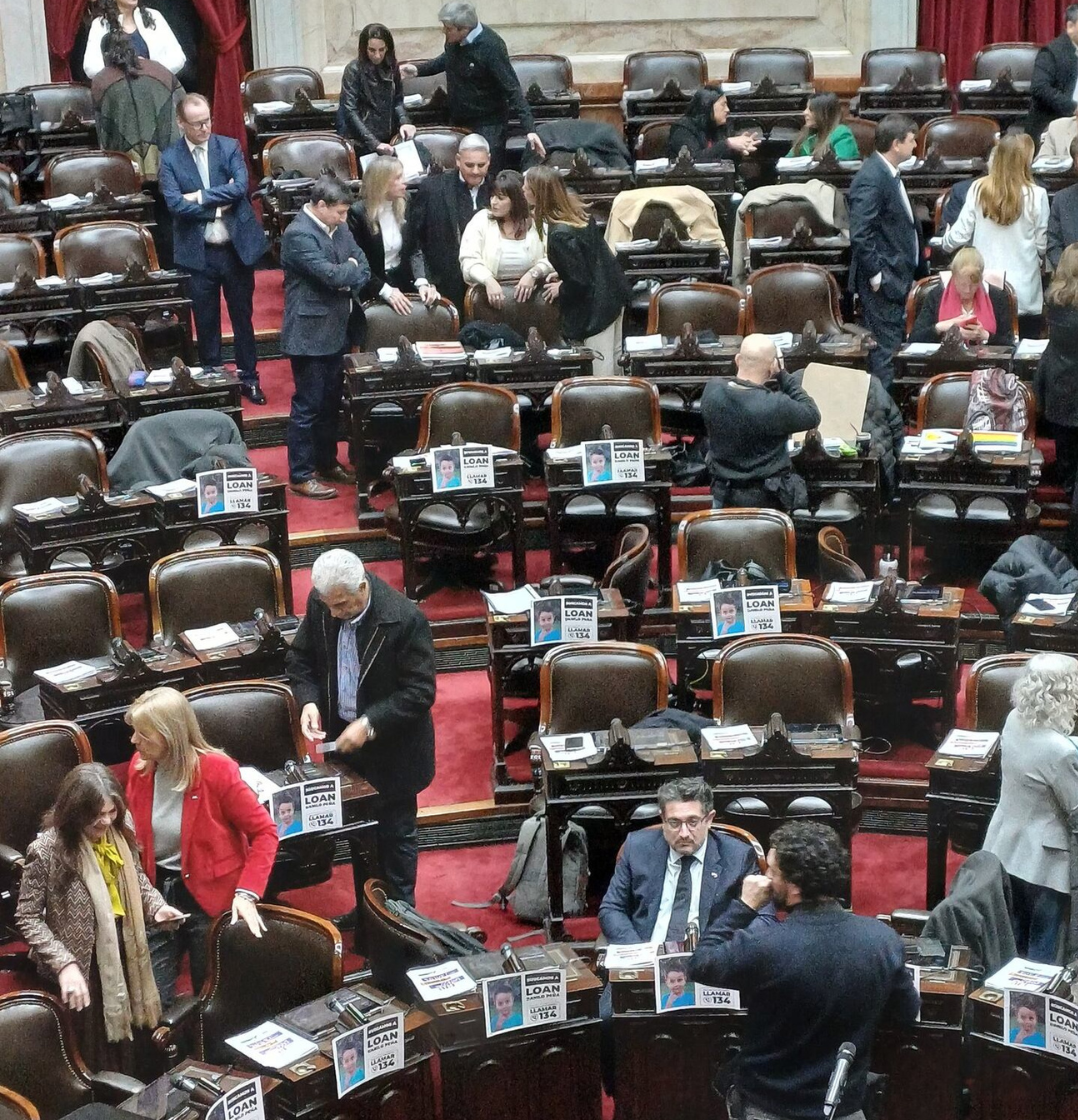 A dos semanas de la desaparición de Loan en Corrientes, varios legisladores de la oposición colocaron carteles de la campaña para encontrarlo en sus bancas, con una foto del menor de 5 años.
