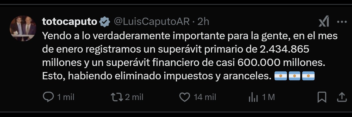 "Yendo a lo verdaderamente importante para la gente, en el mes de enero registramos un superávit primario de 2.434.865 millones y un superávit financiero de casi 600.000 millones”, destacó a través de su cuenta de X.