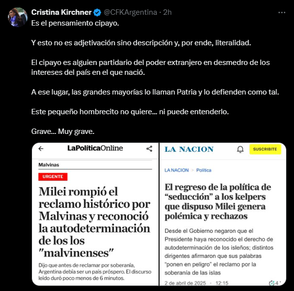 Ante estas declaraciones, la titular del Partido Justicialista no tardó en responder a través de su cuenta de X. “Es el pensamiento cipayo. Y esto no es adjetivación sino descripción y, por ende, literalidad. El cipayo es alguien partidario del poder extranjero en desmedro de los intereses del país en el que nació”.