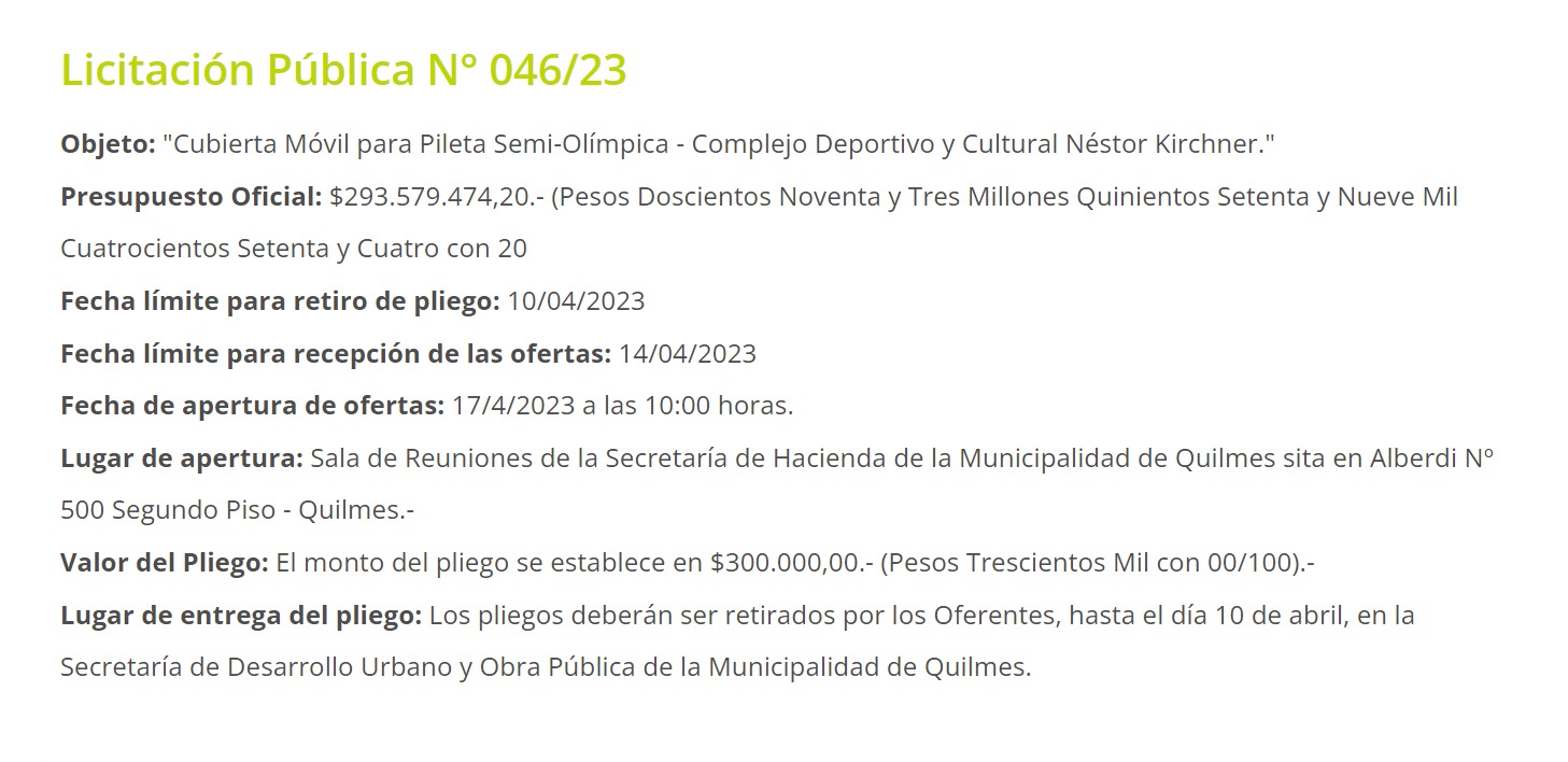 En el complejo deportivo se construyó una cubierta móvil para la piscina semi olímpica  para el que se destinaron $293.579.474,20, según consta en la licitación 046/23.