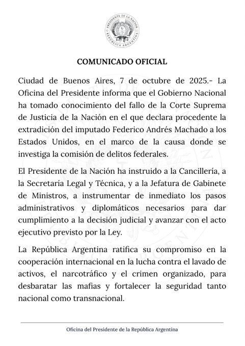 A través de un comunicado oficial, la Casa Rosada informó: “El Gobierno Nacional ha tomado conocimiento del fallo de la Corte Suprema de Justicia de la Nación en el que declara procedente la extradición del imputado Federico Andrés Machado a los Estados Unidos, en el marco de la causa donde se investiga la comisión de delitos federales”.