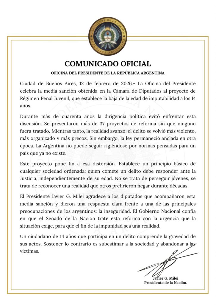 “Durante más de cuarenta años la dirigencia política evitó enfrentar esta discusión. Se presentaron más de 37 proyectos de reforma sin que ninguno fuera tratado. Mientras tanto, la realidad avanzó: el delito se volvió más violento, más organizado y más precoz. Sin embargo, la ley permaneció anclada en otra época. La Argentina no puede seguir rigiéndose por normas pensadas para un país que ya no existe”, señaló el texto oficial.