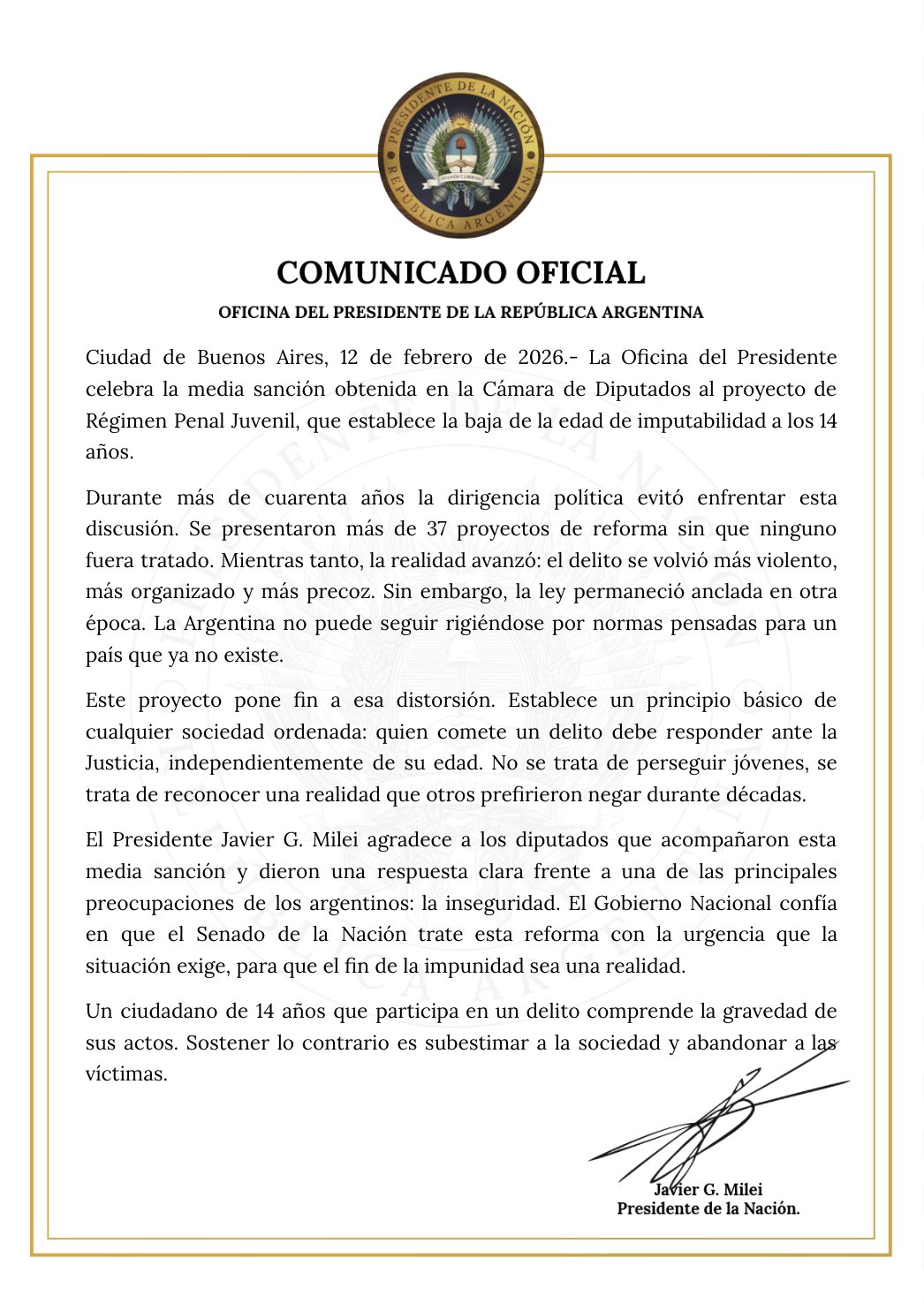 Además, el documento agradeció a los legisladores que apoyaron la medida, destacando la intervención del Presidente Javier G. Milei: “El Presidente Javier G. Milei agradece a los diputados que acompañaron esta media sanción y dieron una respuesta clara frente a una de las principales preocupaciones de los argentinos: la inseguridad”.