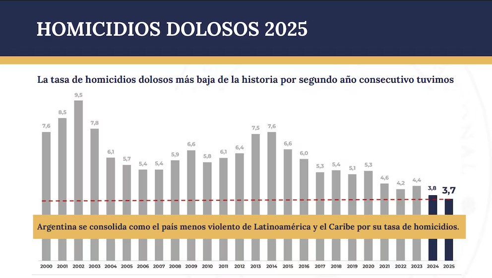 La ministra de Seguridad, Alejandra Monteoliva, anunció una disminución en la tasa de homicidios durante el año pasado, con 3,7 muertes cada 100 mil habitantes, y una caída del 20,8% en robos simples y agravados con respecto al 2024.