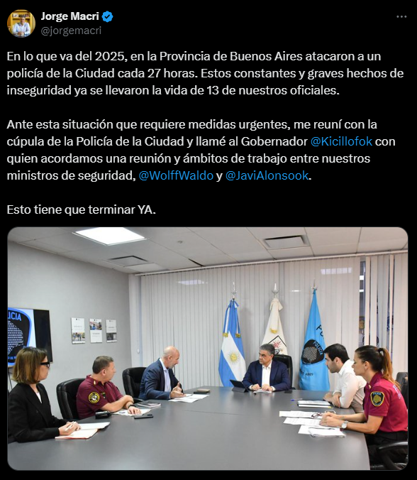 A través de su cuenta de la red social X, Macri recordó que "en lo que va del 2025, en la provincia de Buenos Aires atacaron a un policía de la Ciudad cada 27 horas. Estos constantes y graves hechos de inseguridad ya se llevaron la vida de 13 de nuestros oficiales", manifestó Macri a través de sus redes sociales.