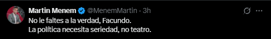 El presidente de la Cámara de Diputados alió poco después, por la misma vía, a responderle: "No le faltes a la verdad, Facundo. La política necesita seriedad, no teatro".