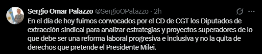 Por su parte, Palazzo sostuvo en su cuenta de X que en la reunión se analizaron "estrategias y proyectos superadores de lo que debe ser una reforma laboral progresiva e inclusiva y no la quita de derechos que pretende el Presidente Milei".