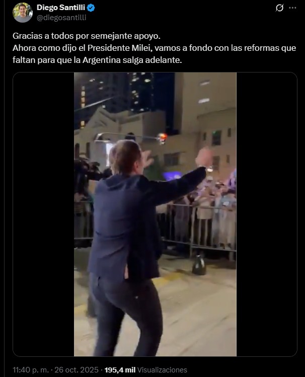 Junto a ese video, Santilli expresó: Gracias a todos por semejante apoyo. Ahora como dijo el Presidente Milei, vamos a fondo con las reformas que faltan para que la Argentina salga adelante".