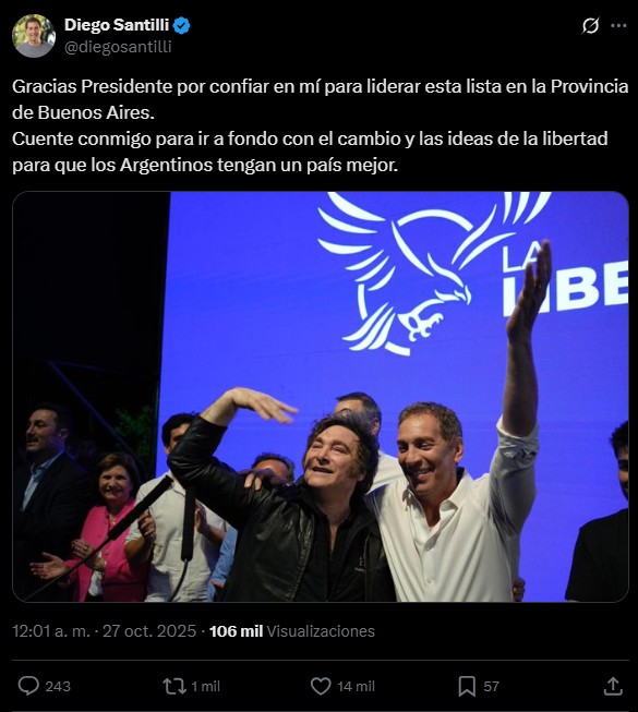 Allí, Santilli escribió: Gracias Presidente por confiar en mí para liderar esta lista en la Provincia de Buenos Aires" y añadió: "Cuente conmigo para ir a fondo con el cambio y las ideas de la libertad para que los Argentinos tengan un país mejor".