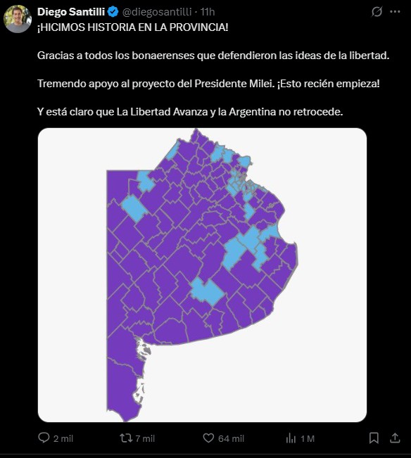 El primero de ellos fue con un mensaje claro pero contundente. Acompañado de un mapa del territorio bonaerense que muestra todos los distritos donde el oficialismo se llevó el triunfo. En pocas palabras, el exvicejefe de Gobierno porteño escribió: "¡HICIMOS HISTORIA EN LA PROVINCIA! Gracias a todos los bonaerenses que defendieron las ideas de la libertad.. Tremendo apoyo al proyecto del Presidente Milei. ¡Esto recién empieza!. Y está claro que La Libertad Avanza y la Argentina no retrocede", señaló.