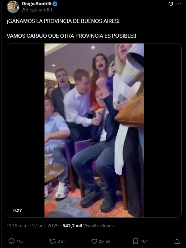 Quizás incrédulo luego de que ni desde el propio seno de La Libertad Avanza esperaran ganar la provincia de Buenos Aires, el candidato que debió reemplazar a Espert casi de un día para el otro yendo solo a las caminatas y luego de que Milei decidiera enfocarse en el interior, Santilli no pudo ocultar su felicidad tras confirmarse su triunfo y así lo hizo saber a través de varios mensajes.
