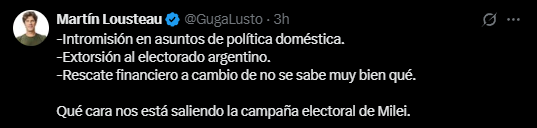 El senador radical y candidato a diputado Martín Lousteau sostuvo: "Trump no quiere ayudar a un país. Solo busca salvar a Milei. Nada bueno puede salir de todo esto. Los argentinos vamos a pagar muy caro el rescate de un gobierno que perdió el rumbo".
