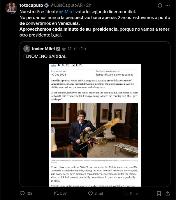 Allí, el titular del Palacio de Hacienda escribió: "nuestro Presidente @JMilei votado segundo líder mundial. No perdamos nunca la perspectiva: hace apenas 2 años estuvimos a punto de convertirnos en Venezuela. Aprovechemos cada minuto de su presidencia, porque no vamos a tener otro presidente igual", señaló.
