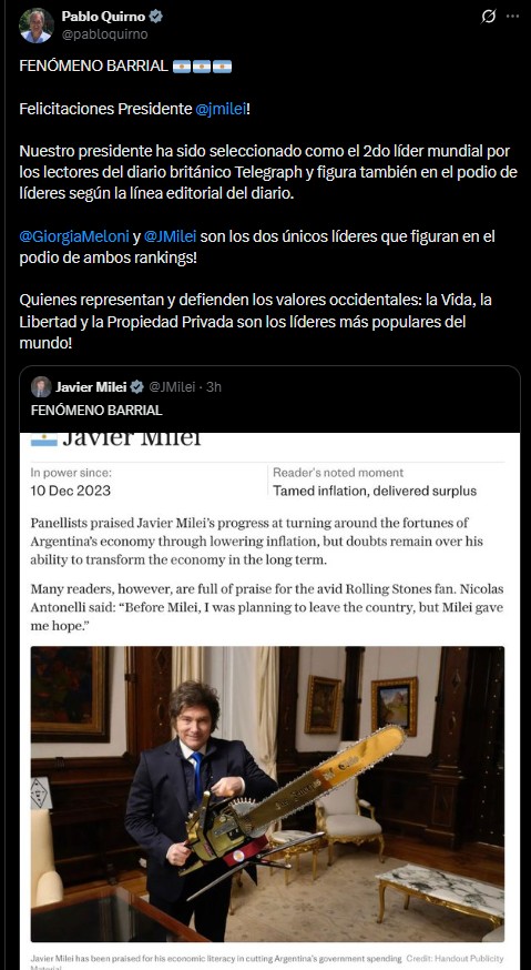 En tanto, el canciller Pablo Quirno también expresó su satisfacción en la ex red social del pajarito y reposteó un mensaje de Milei al que tituló "Fenómeno Barrial", tal como lo había hecho un rato antes el propio presidente, quien acompañó la publicación con una captura de pantalla del medio británico donde se lo puede ver con una motosierra dentro de su despacho.