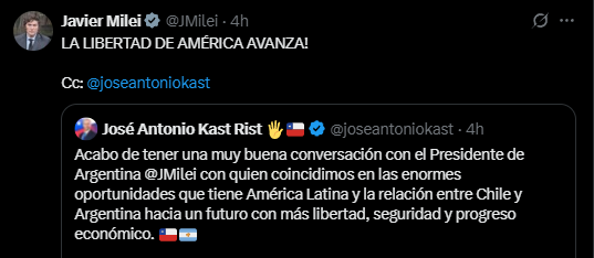 El posteo de Milei se produjo en respuesta al mensaje de Kast en esa misma red social, en el que había anunciado la "muy buena conversación" telefónica que mantuvo con el líder libertario.