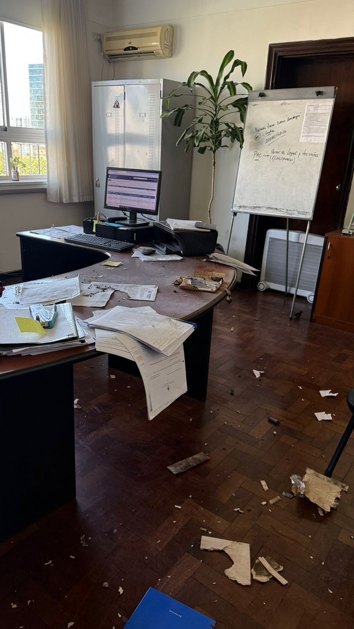 Se difundieron las primeras imágenes posteriores a la explosión de un artefacto en la Escuela Superior de Gendarmería Nacional Argentina, ubicada en la avenida Paseo Colón y México, en la Ciudad de Buenos Aires. El material, al que accedió TodoNoticias, muestra fragmentos del dispositivo esparcidos sobre un escritorio y el piso del piso 11 del edificio, donde ocurrió la detonación.