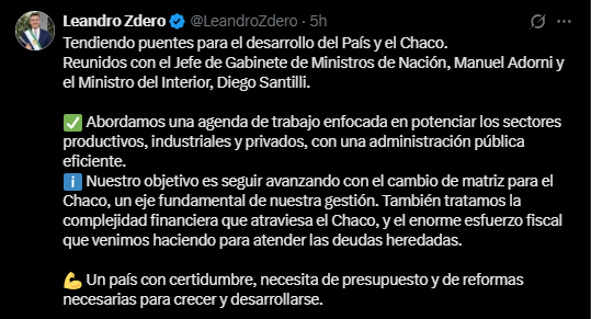 En simultáneo, informó a través de su cuenta de X: “Abordamos una agenda de trabajo enfocada en potenciar los sectores productivos, industriales y privados, con una administración pública eficiente”, expresó Zdero.