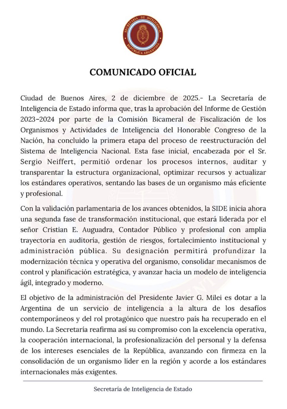 El Gobierno Nacional confirmó la salida de Sergio Neiffert como director de la Secretaria de Inteligencia del Estado (SIDE) y anunció como su reemplazante a Cristian Auguadra, quien hasta hoy estaba a cargo de la división de Asuntos Internos del organismo.