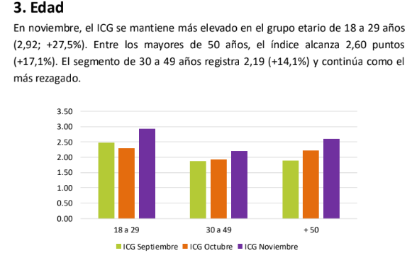También se observa un cambio en la dinámica etaria. Por primera vez desde la asunción de Milei, el grupo de 30 a 49 años encabeza la confianza con 2,33 puntos (+9,4%), seguido por los mayores de 50 (2,29; -7,3%).