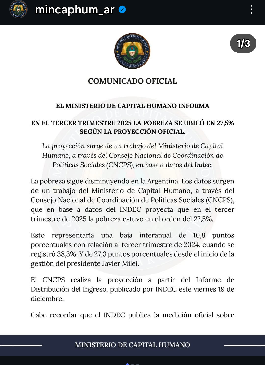 El ministerio de Capital Humano que es conducido por Sandra Pettovello publicó esta tarde que la pobreza en Argentina durante el tercer trimestre del 2025 se redujo al 27,5%, según una proyección del Consejo Nacional de Coordinación de Políticas Sociales (CNCPS) basada en información del Instituto Nacional de Estadística y Censos (Indec).